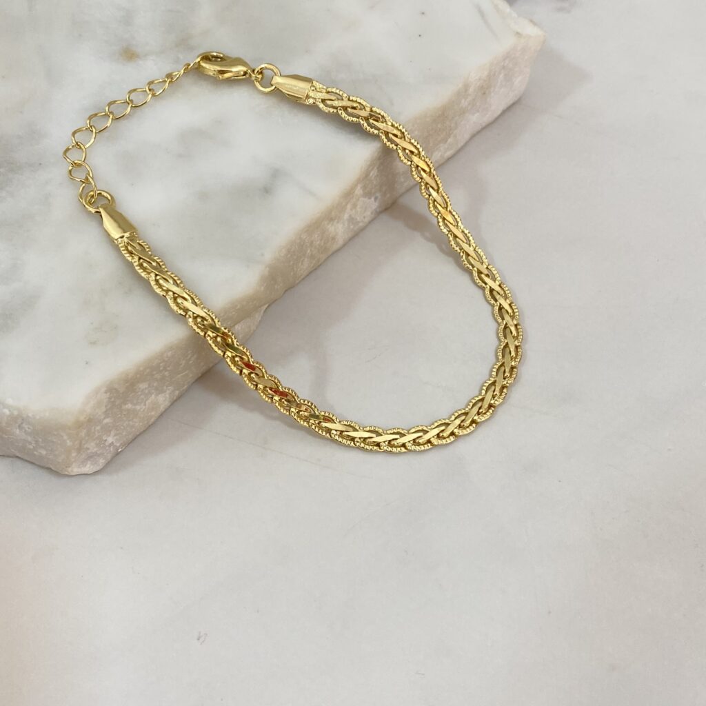 Pulsera modelo cadena trenzada toda trabajada, con extensor. Bañada en oro 18k y un año de garantia