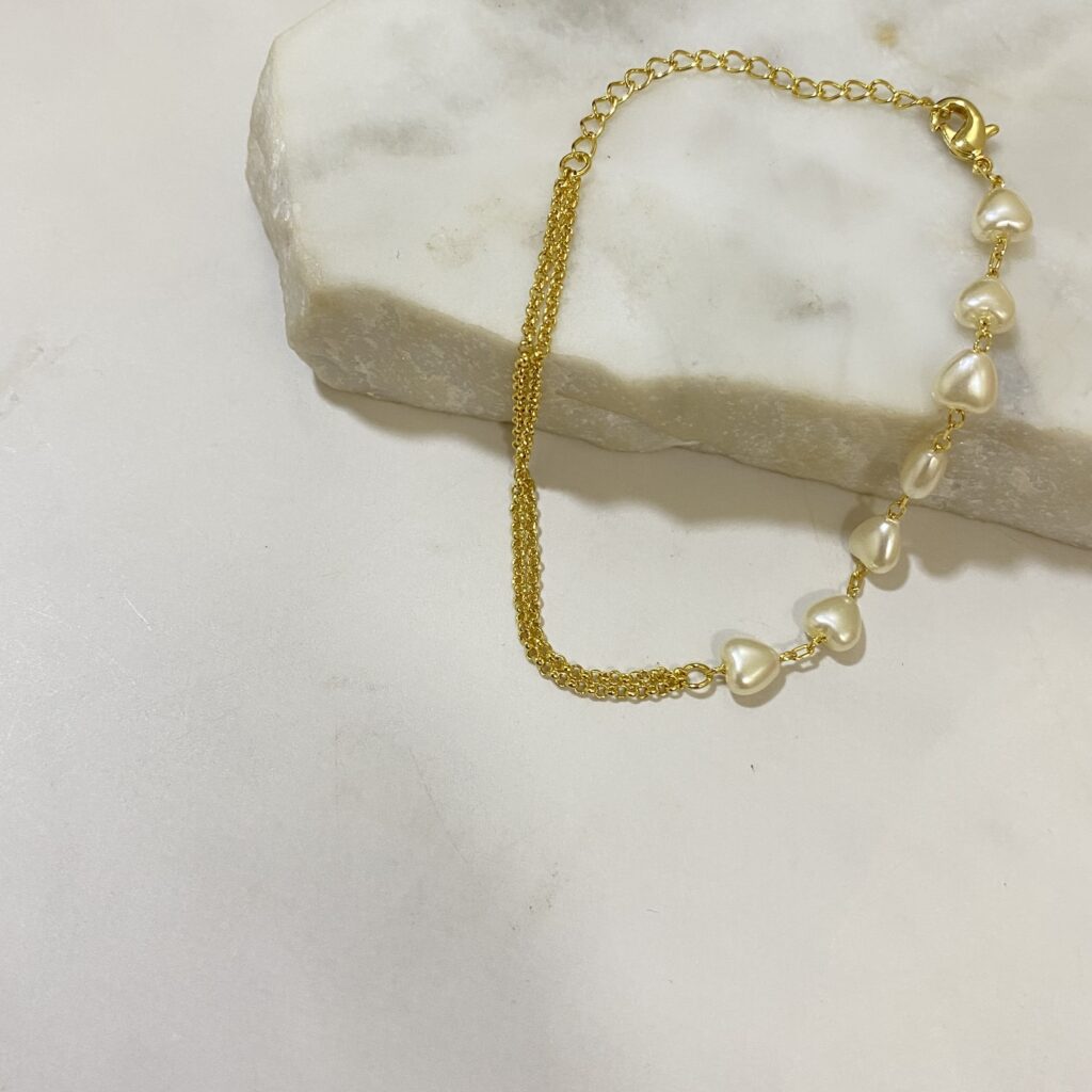 Pulsera doble cadena corazones perlados pegados con extensor bañado en oro 18k con un año de garantía