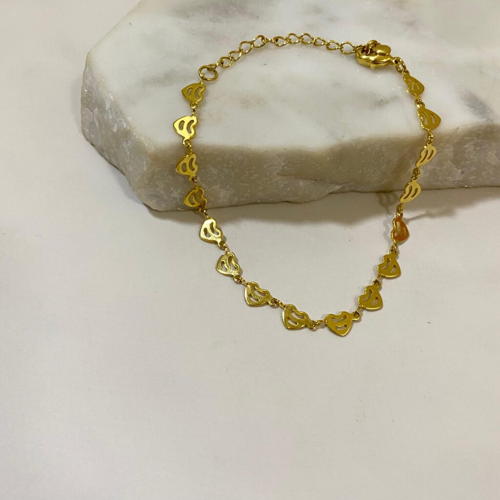 Pulsera elos eslabones corazoncitos pegados con extensor bañada en oro 18k con un año de garantía