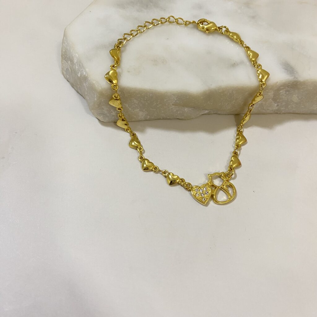 Pulsera elo corazones pegados con extensor gatito vazado con corazón tachonado bañado en oro 18k y un año de garantía