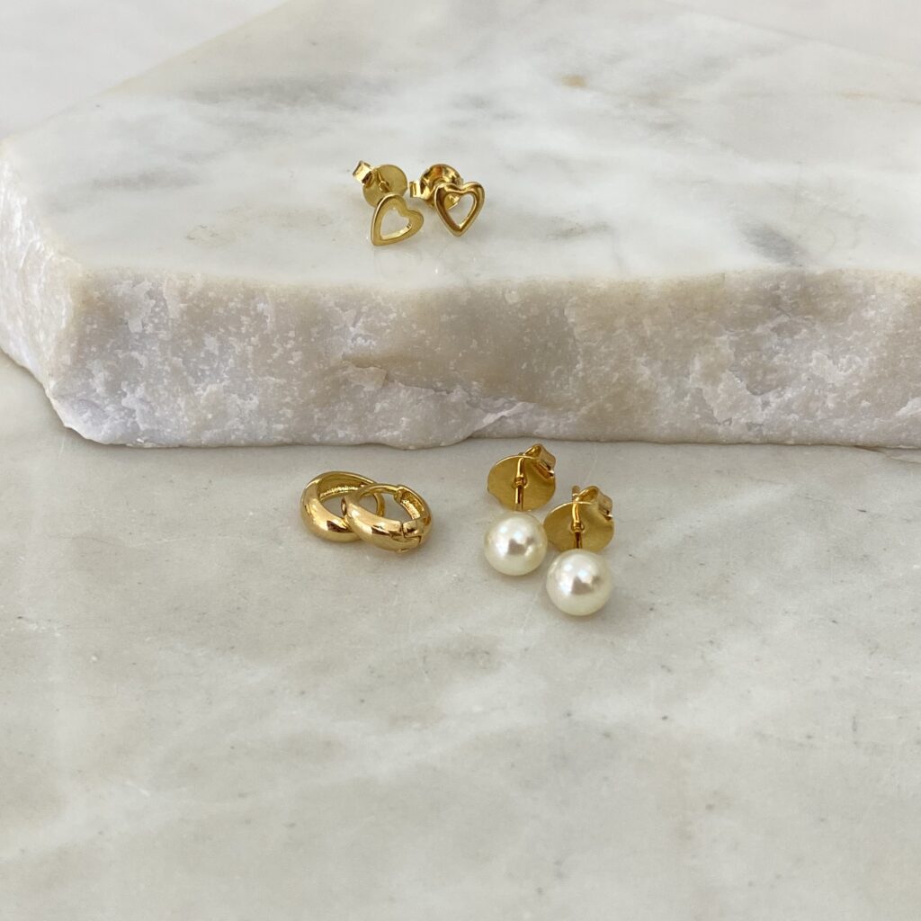 Trío de aros mini argollita, aro perla tamaño P y aro corazón vazados tamaño P bañados en oro 18 k y con un año de garantía.